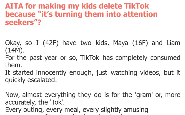 "AITA for making my kids delete TikTok because “it’s turning them into attention seekers”?"
