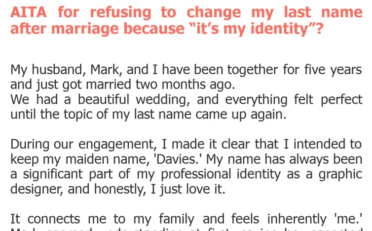 Welcome back, relationship warriors! Today, we're diving into a marital conundrum that's as old as time, yet perpetually fresh: the last name debate. It's a deeply personal decision, often fraught with expectations, traditions, and a hefty dose of identity politics. Our OP today brings us a story where her refusal to adopt her husband's surname has ignited a firestorm, leaving both sides feeling unheard. Let's unpack this!\nFor many, taking a spouse's name symbolizes unity and a new chapter. For others, it feels like erasing a part of who they are, a piece of their history and lineage. This isn't just about a name; it's about autonomy, respect, and navigating the intricate dance of two lives merging. Our OP's "identity" argument might resonate with many, but has it gone too far, or is her husband overreacting?
