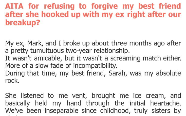 "AITA for refusing to forgive my best friend after she hooked up with my ex right after our breakup?"