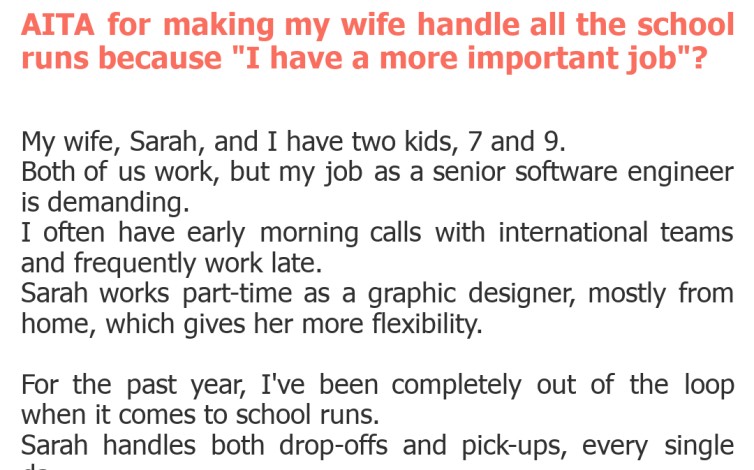 "AITA for making my wife handle all the school runs because "I have a more important job"?"