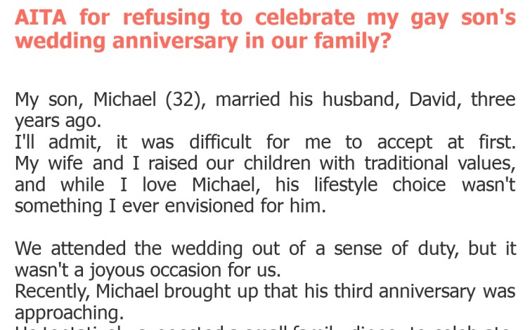 "AITA for refusing to celebrate my gay son's wedding anniversary in our family?"