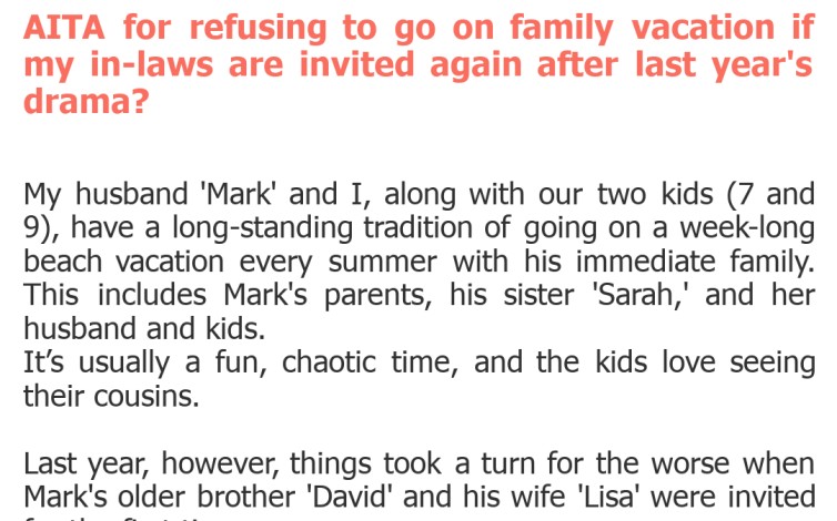 AITA for refusing to go on family vacation if my in-laws are invited again after last year’s drama?