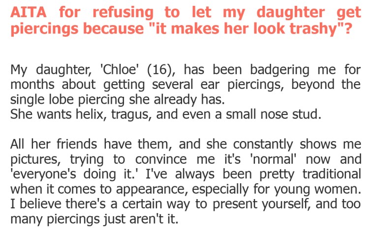 "AITA for refusing to let my daughter get piercings because "it makes her look trashy"?"