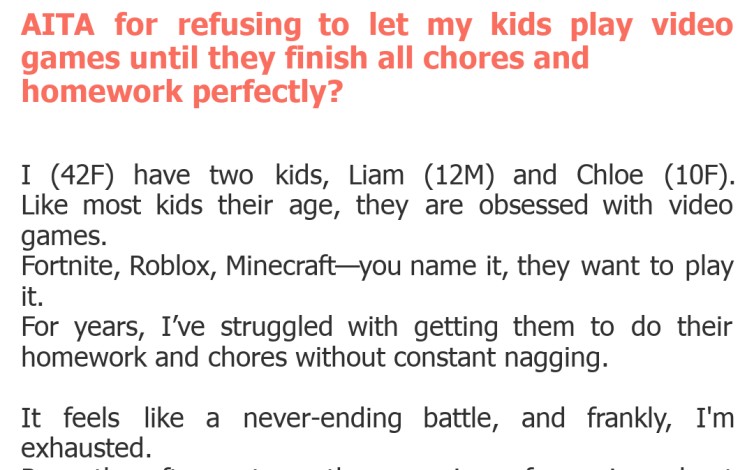 "AITA for refusing to let my kids play video games until they finish all chores and homework perfectly?"