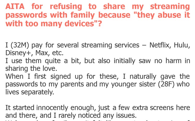 "AITA for refusing to share my streaming passwords with family because "they abuse it with too many devices"?"