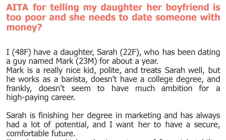 Oh, the age-old dilemma of parents wanting the best for their children, which often translates into wanting financial security. This week, we're diving into a particularly thorny AITA post where a mother explicitly told her daughter that her boyfriend isn't 'good enough' because of his modest financial standing. It's a situation that many can relate to, either as the parent or the child caught in the crossfire of love and lucre. What constitutes 'the best' is often subjective. Is it true love and happiness, or a sturdy financial foundation?