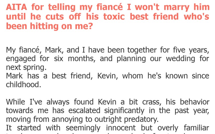 "AITA for telling my fiancé I won't marry him until he cuts off his toxic best friend who's been hitting on me?"