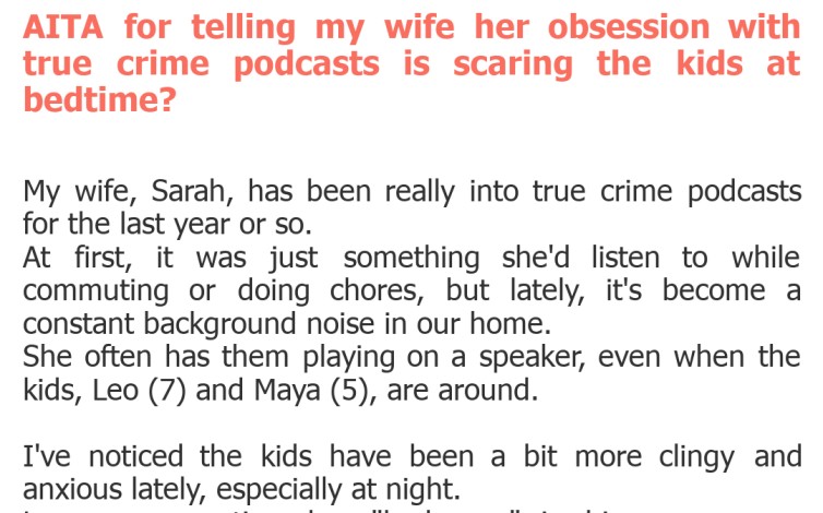 "AITA for telling my wife her obsession with true crime podcasts is scaring the kids at bedtime?"