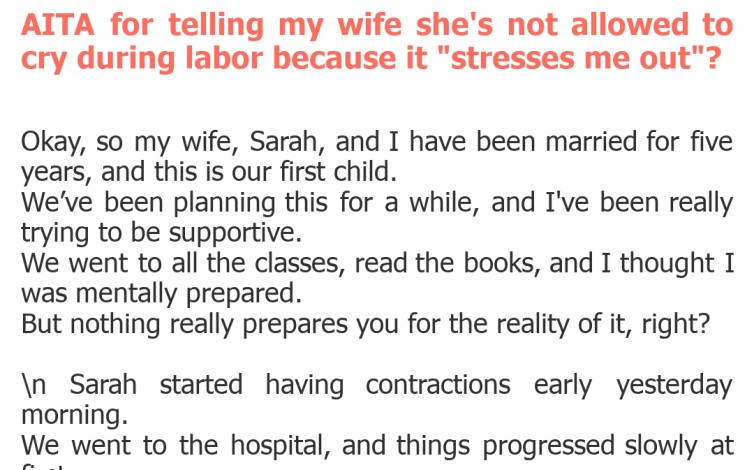 "AITA for telling my wife she's not allowed to cry during labor because it "stresses me out"?"