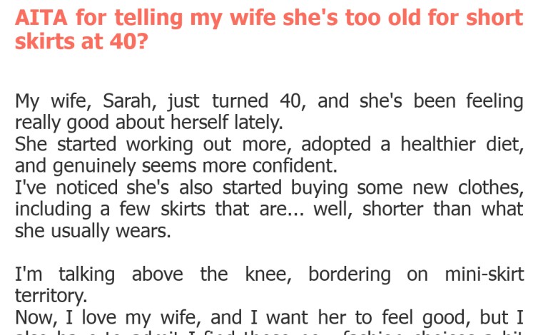 However, the phrasing and context are crucial. Telling someone they are 'too old' for a particular style is inherently judgmental and dismissive of their personal autonomy and self-expression. His wife, Sarah, had clearly been working on her self-confidence and enjoying her new style, which he then undermined. This isn't just about a skirt; it's about invalidating her feelings and choices, implying that her body and age dictate her fashion freedom. This can be deeply hurtful and erode trust.