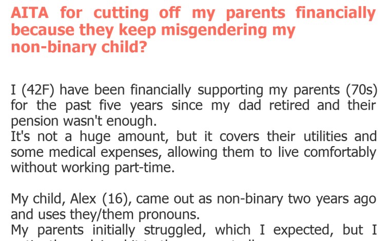 "AITA for cutting off my parents financially because they keep misgendering my non-binary child?"