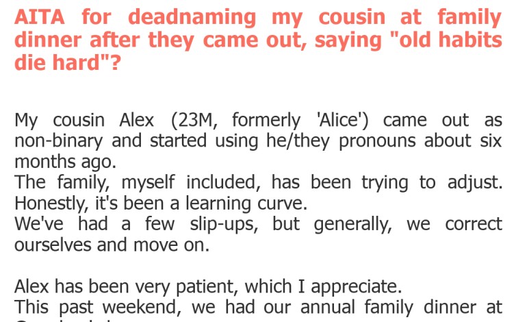 "AITA for deadnaming my cousin at family dinner after they came out, saying "old habits die hard"?"