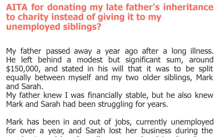 AITA for donating my late father’s inheritance to charity instead of giving it to my unemployed siblings?