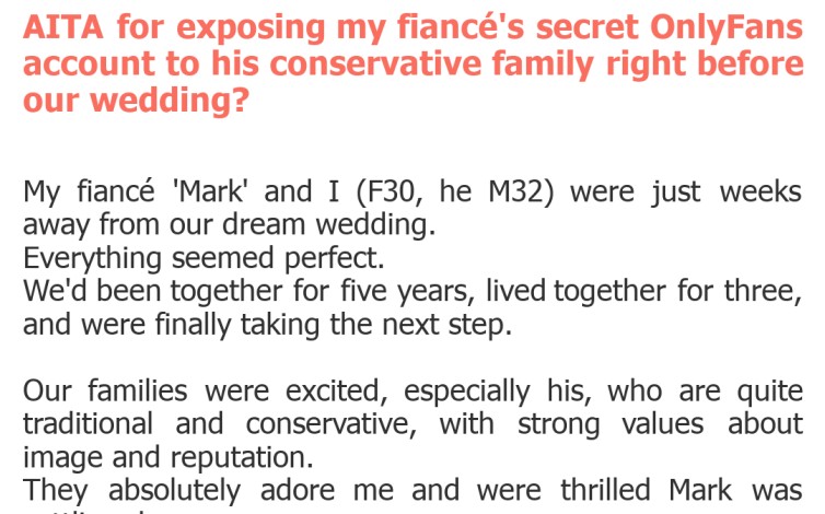 "AITA for exposing my fiancé's secret OnlyFans account to his conservative family right before our wedding?"