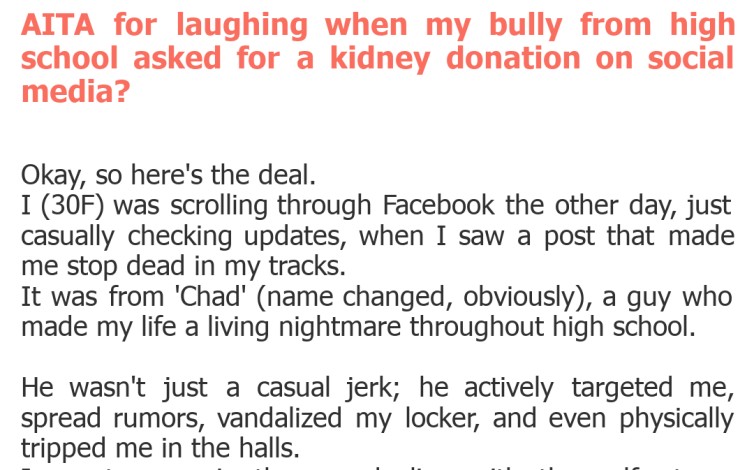 "AITA for laughing when my bully from high school asked for a kidney donation on social media?"