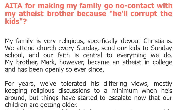 "AITA for making my family go no-contact with my atheist brother because "he'll corrupt the kids"?"