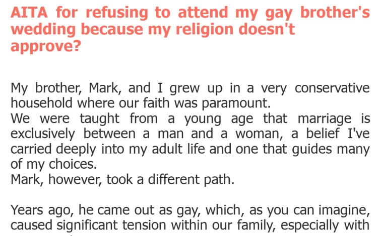 "AITA for refusing to attend my gay brother's wedding because my religion doesn't approve?"