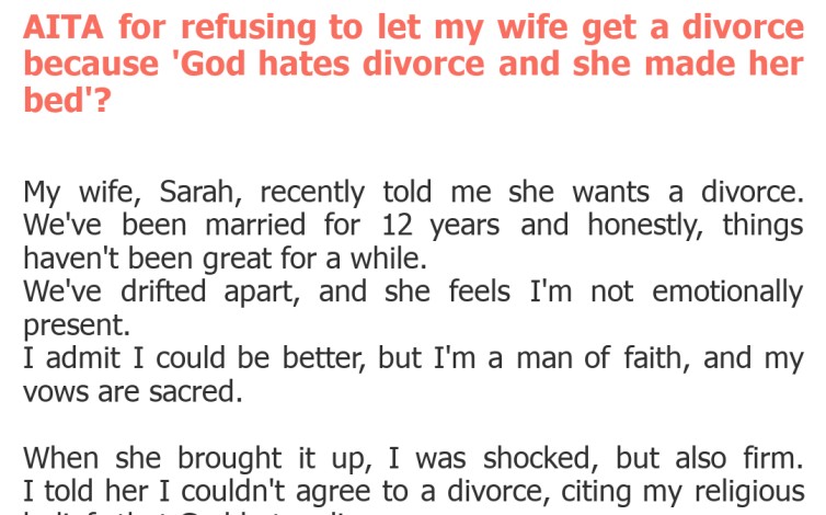 "AITA for refusing to let my wife get a divorce because 'God hates divorce and she made her bed'?"
