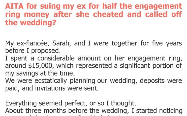 "AITA for suing my ex for half the engagement ring money after she cheated and called off the wedding?"