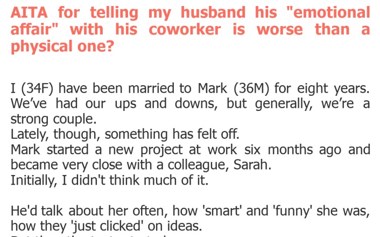 AITA for telling my husband his “emotional affair” with his coworker is worse than a physical one?