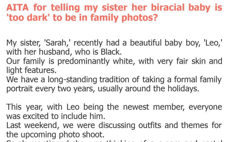 "AITA for telling my sister her biracial baby is 'too dark' to be in family photos?"