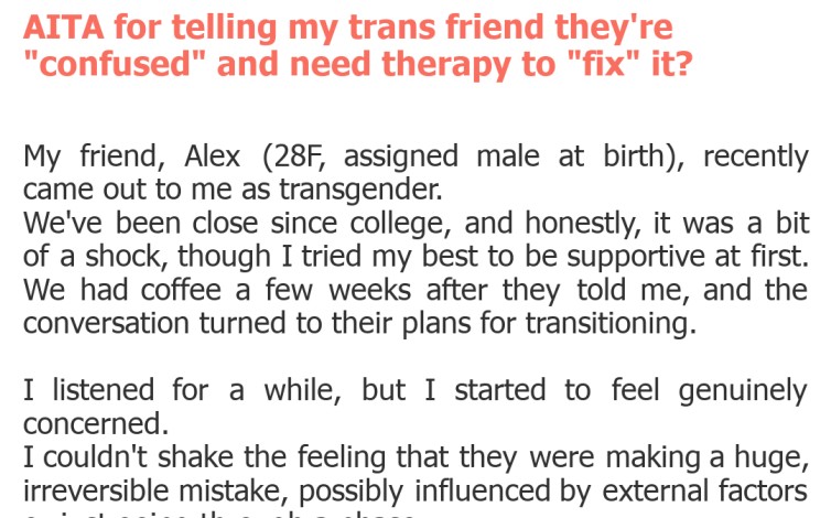 Welcome back, folks, to another installment of "Am I The A**hole?" Today, we're diving into a deeply sensitive topic involving friendship, identity, and unsolicited advice. Our poster is grappling with the fallout of a conversation with a trans friend, and the community is ready to weigh in on whether their intentions, however misguided, crossed a line.