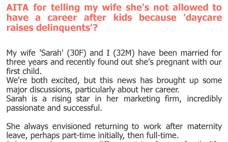 AITA for telling my wife she’s not allowed to have a career after kids because ‘daycare raises delinquents’?