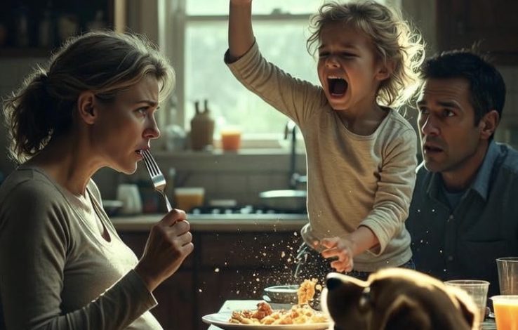 Eat up, sweetheart—it’s organic blueberry, good for the baby,” the husband said softly, his tone warm and practiced, as he placed a large slice onto his pregnant wife’s plate. Without warning, their six-year-old daughter slammed her small hand down on the table with all her strength.