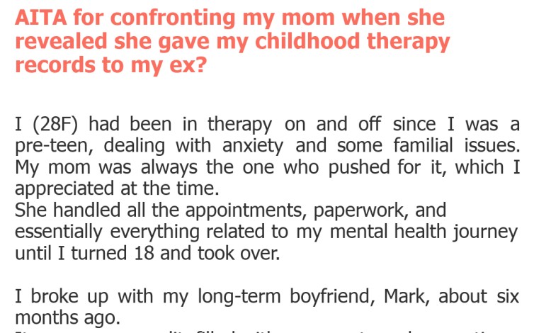 "AITA for confronting my mom when she revealed she gave my childhood therapy records to my ex?"