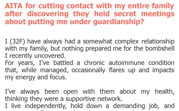 "AITA for cutting contact with my entire family after discovering they held secret meetings about putting me under guardianship?"