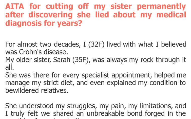 "AITA for cutting off my sister permanently after discovering she lied about my medical diagnosis for years?"
