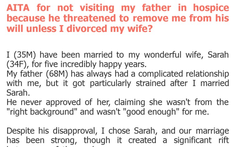 "AITA for not visiting my father in hospice because he threatened to remove me from his will unless I divorced my wife?"