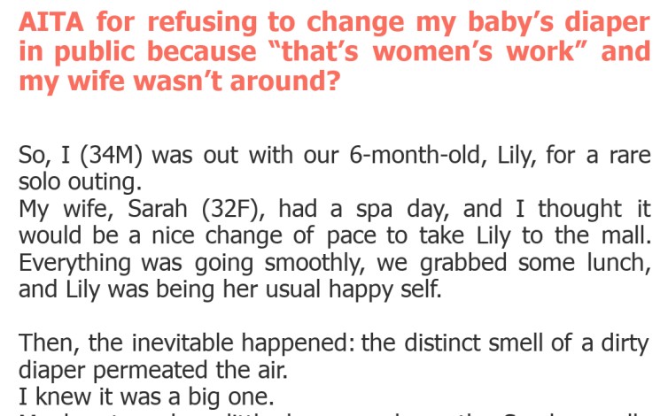 "AITA for refusing to change my baby’s diaper in public because “that’s women’s work” and my wife wasn’t around?"