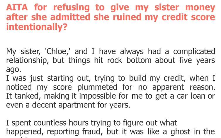 "AITA for refusing to give my sister money after she admitted she ruined my credit score intentionally?"