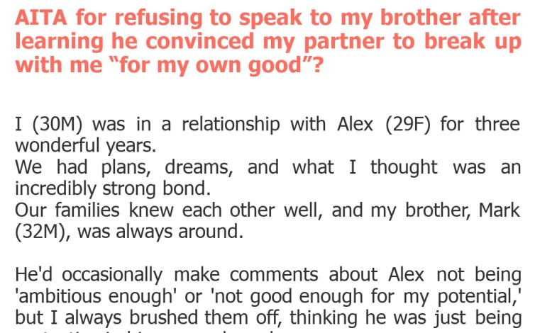 "AITA for refusing to speak to my brother after learning he convinced my partner to break up with me “for my own good”?"