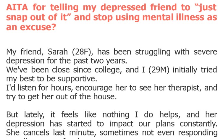 "AITA for telling my depressed friend to “just snap out of it” and stop using mental illness as an excuse?"