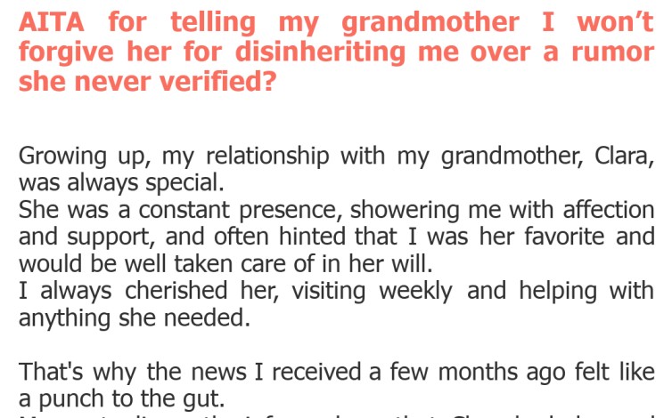 "AITA for telling my grandmother I won’t forgive her for disinheriting me over a rumor she never verified?"