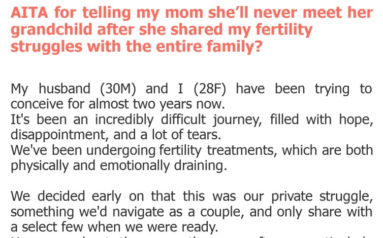 "AITA for telling my mom she’ll never meet her grandchild after she shared my fertility struggles with the entire family?"