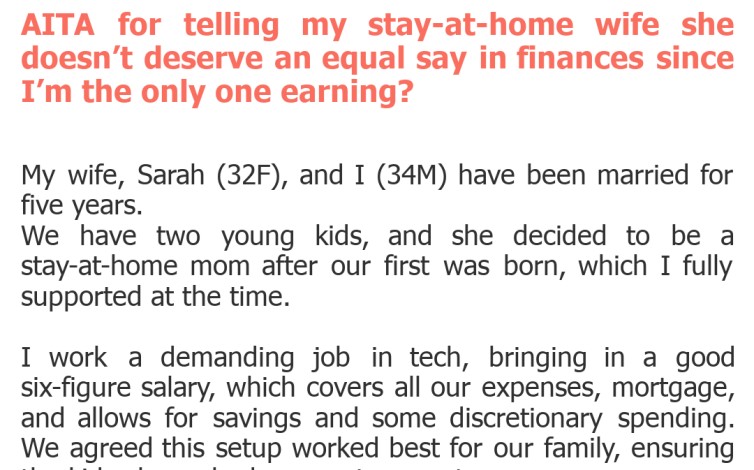 "AITA for telling my stay-at-home wife she doesn’t deserve an equal say in finances since I’m the only one earning?"