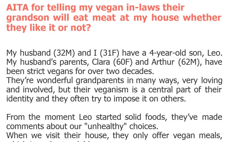 "AITA for telling my vegan in-laws their grandson will eat meat at my house whether they like it or not?"