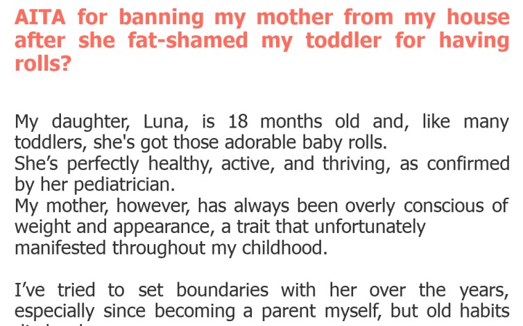 "AITA for banning my mother from my house after she fat-shamed my toddler for having rolls?"