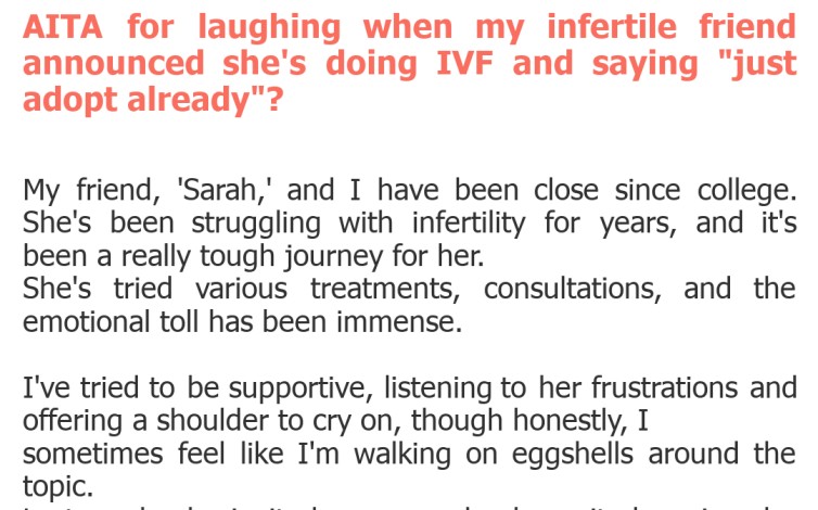 "AITA for laughing when my infertile friend announced she's doing IVF and saying "just adopt already"?"