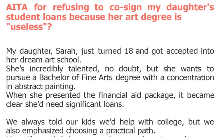 "AITA for refusing to co-sign my daughter's student loans because her art degree is "useless"?"