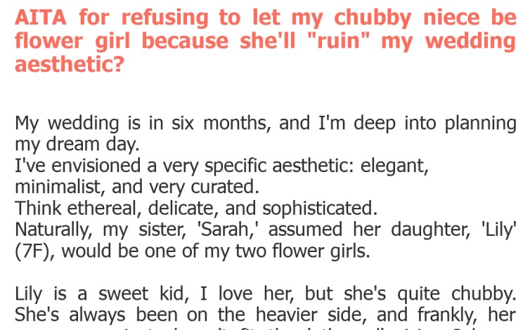 AITA for refusing to let my chubby niece be flower girl because she’ll “ruin” my wedding aesthetic?