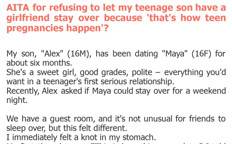 "AITA for refusing to let my teenage son have a girlfriend stay over because 'that's how teen pregnancies happen'?"