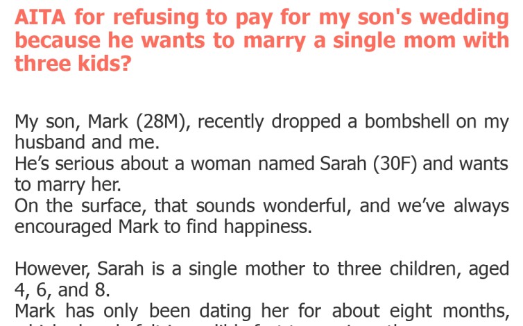 "AITA for refusing to pay for my son's wedding because he wants to marry a single mom with three kids?"