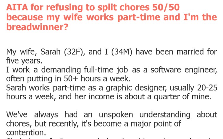 Ah, the age-old debate of household chores! It's a tale as old as time, or at least as old as shared living spaces. Today, we're diving into a particularly spicy one that adds another layer to the mix: differing work schedules and financial contributions. When one partner is the primary breadwinner and the other works part-time, does the traditional 50/50 split of domestic duties still apply? Let's unpack this sticky situation.\nOur anonymous poster, whom we'll call 'Breadwinner Bob,' finds himself in a marital dispute over exactly this. He believes his full-time job and higher income warrant a different chore distribution, arguing his wife, who works part-time, should naturally pick up more slack around the house. Is this a pragmatic approach to division of labor, or a recipe for resentment? Read on to hear Bob's side and form your own judgment.