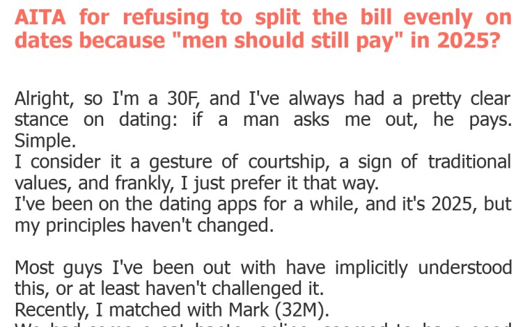 "AITA for refusing to split the bill evenly on dates because "men should still pay" in 2025?"