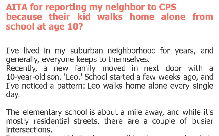 "AITA for reporting my neighbor to CPS because their kid walks home alone from school at age 10?"