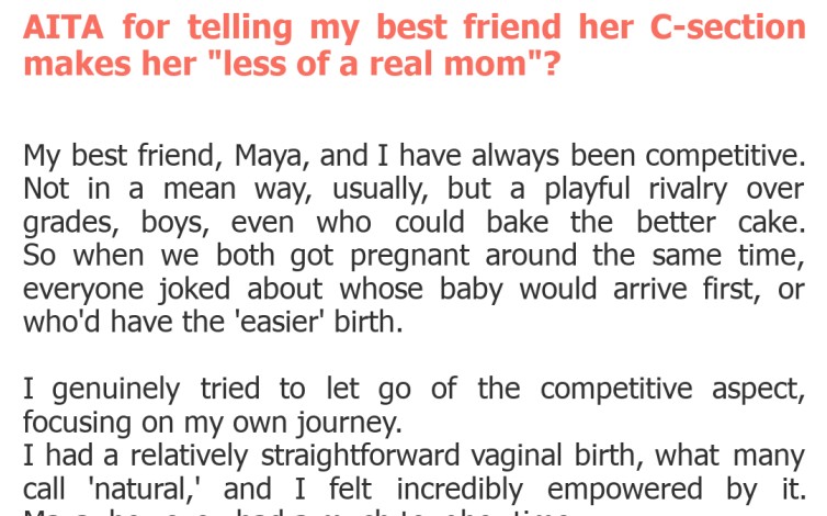 Oh boy, do we have a doozy today, folks! The world of new motherhood is a beautiful, messy, and often incredibly sensitive space. Every mom's journey to bringing a child into the world is unique, powerful, and deeply personal. It's a time when support, understanding, and empathy are absolutely paramount. Unfortunately, sometimes even the closest friendships can hit a rocky patch when expectations and judgments creep in, especially around such a vulnerable topic as childbirth.\nThis week's AITA story throws us right into the deep end of maternal gatekeeping, a topic that sparks passionate debate. Our Original Poster (OP) found herself in hot water after a comment to her best friend about her C-section. The phrase in question? Something about being "less of a real mom." Yikes. Let's dive into the full story and unpack the layers of this challenging situation. Prepare for some strong opinions!